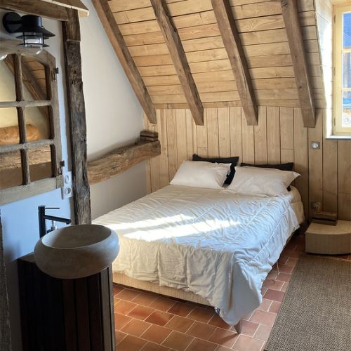 A l'étage, deux lits doubles 160x200, séparables en quatre lits de 80x200 et deux lits cabine en hauteur de 80x180. Douche et WC séparés, trois lavabos. Piano droit. Vue sur le jardin et la rivière.