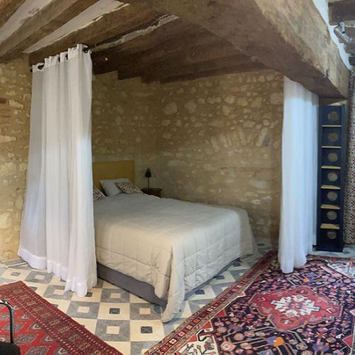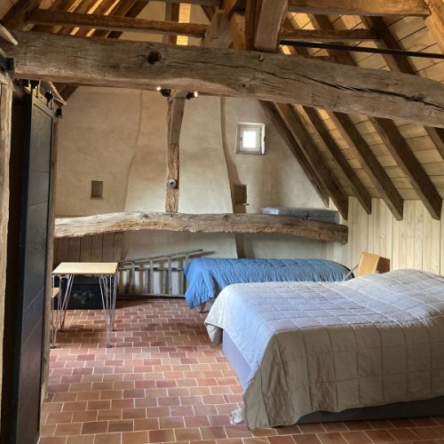 Au Rez-de-chaussée, studio avec coin cuisine. Salle d’eau avec douche et lavabo. WC séparé. Un lit double 160x200, séparable en deux lits de 80x200. Piano droit. Communique avec la chapelle et la terrasse. Studio accessible PMR.