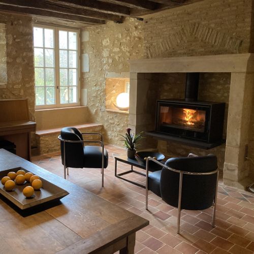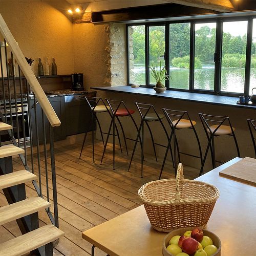 Cuisine aménagée - salle à manger avec grand bar en ardoise surplombant le Loir.